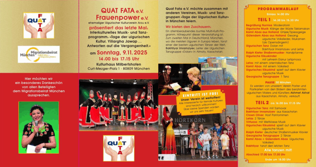 Liebe Freunde, wir laden Euch zum 5. Interkulturellen Tanz- und Musikfest ein. Das 5. Interkulturelle Tanz- und Musikfest, organisiert und moderiert von Nurnisa Ismail vom Quat Fata eV / Frauenpower, bietet die Gelegenheit, mit Menschen anderer Kulturen zusammen zu kommen, um zu hören und zu sehen, welche Musik, Tänze und Texte sie uns als lebendigen Teil ihrer Kulturen vorstellen.